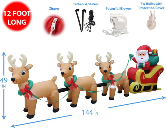 12 Foot Long Lighted Christmas Inflatable Santa Claus on Sleigh with 3 Reindeer Lights Decor Outd...